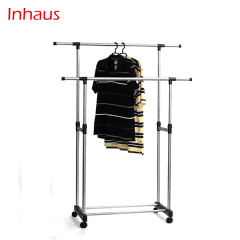 デュアルパイプクロスポールハンガー、ポータブルステンレススチールウェアポールハンガー、ホイール上の拡張可能なガーメントラック